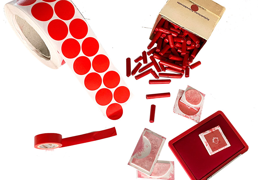Gib der Karte deine Note und gestalte sie mit Rot, sei es mit Klebepunkten, Stiften, Klebestreifen oder Stempeln!